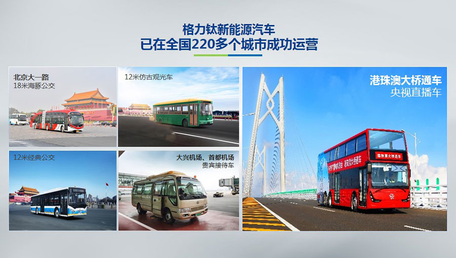目前,格力鈦生產(chǎn)的新能源汽車于北京、杭州、武漢、青島、哈爾濱、包頭、??诘热珖?20多個城市運(yùn)營。2014年,仿古鐺鐺車榮膺第22屆北京APEC會議官方指定用車、登陸北京環(huán)天安門旅游觀光線。2016年,雙層巴士榮膺第二屆中美低碳峰會指定用車、登陸國內(nèi)首條純電動雙層觀光車線路——北京城市旅游觀光3線。2017年,18米海豚公交車投入北京長安街1路運(yùn)營。2018年,港珠澳大橋正式通車,雙層巴士擔(dān)綱中央廣播電視總臺直播車,成為首輛駛上港珠澳大橋的大巴車。