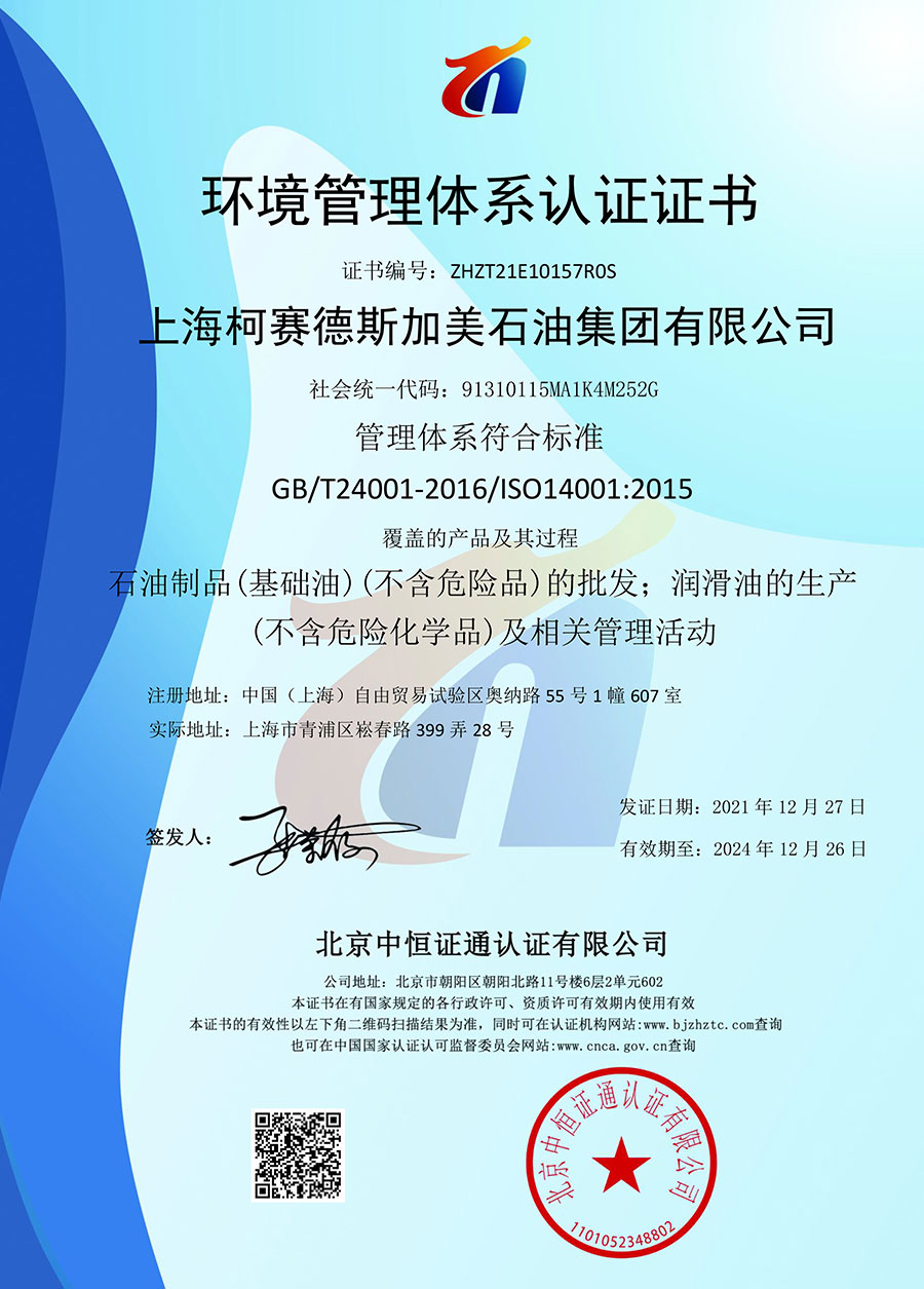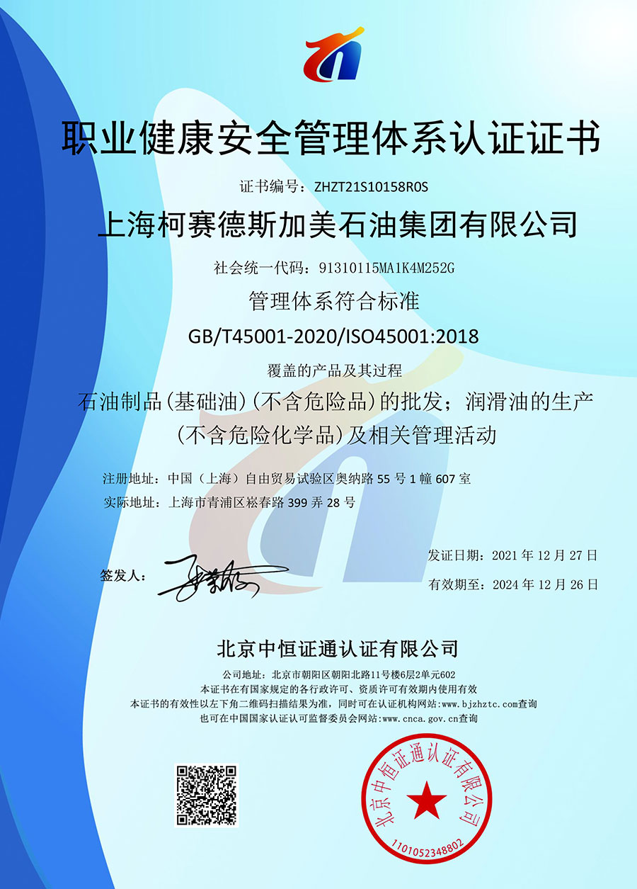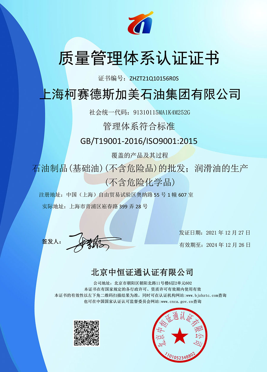 柯賽德斯集團(tuán)公司統(tǒng)一遵循嚴(yán)格的質(zhì)量保證體系,先后通過了武器裝備質(zhì)量管理體系認(rèn)證GJB9001C-2017、ISO/TS16949、IS09001質(zhì)量體系認(rèn)證、1S014001環(huán)境體系認(rèn)證及ISO45001:2018職業(yè)健康安全管理體系認(rèn)證。隨著業(yè)務(wù)領(lǐng)域的不斷擴(kuò)展,目前柯賽德斯集團(tuán)公司先后與多家世界能源、化工方面的巨頭建立了產(chǎn)品服務(wù)、供應(yīng)保障、技術(shù)合作、技術(shù)特別支持單位等方面的戰(zhàn)略合作關(guān)系。今天,柯賽德斯集團(tuán)公司旗下管理著三大潤(rùn)滑油品牌,實(shí)現(xiàn)了經(jīng)營(yíng)上的多元化戰(zhàn)略格局。
