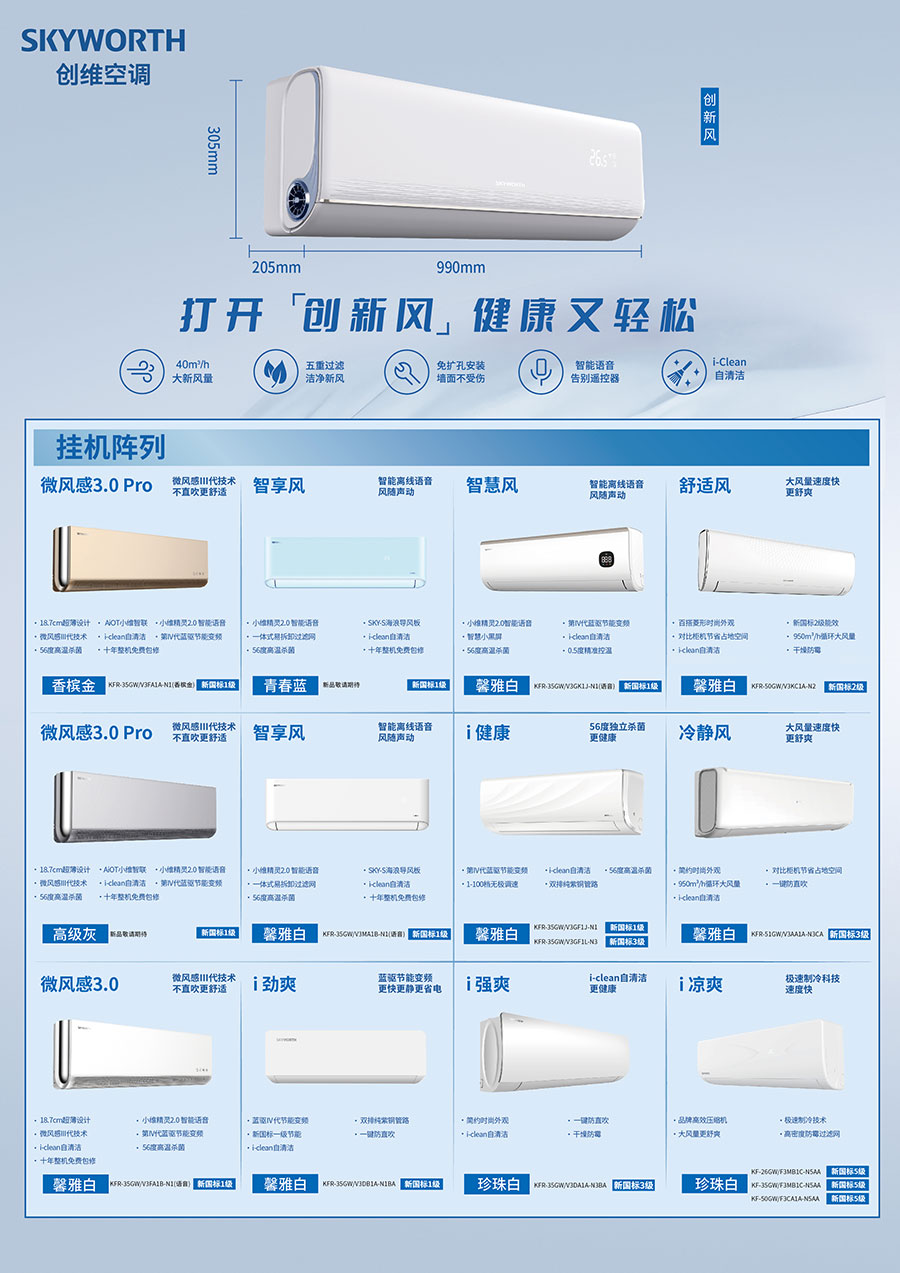 主要產(chǎn)品:SKYWORTH(創(chuàng)維)家用空調(diào)、商用空調(diào)、車用空調(diào)、廚房空調(diào)、移動空調(diào)、凈化器等產(chǎn)品