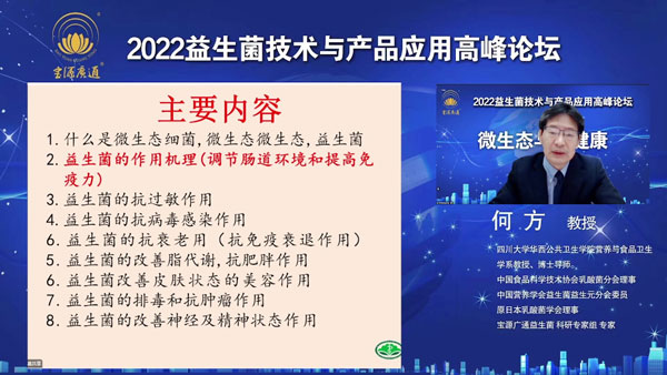 何方教授從益生菌對(duì)人體健康的眾多重要作用,又從科研實(shí)驗(yàn)及國(guó)內(nèi)外全球視角把益生菌的功能、產(chǎn)品應(yīng)用做了專(zhuān)業(yè)講解。對(duì)寶源廣通益生菌的菌株、高活菌等科學(xué)組方做了分析推薦。