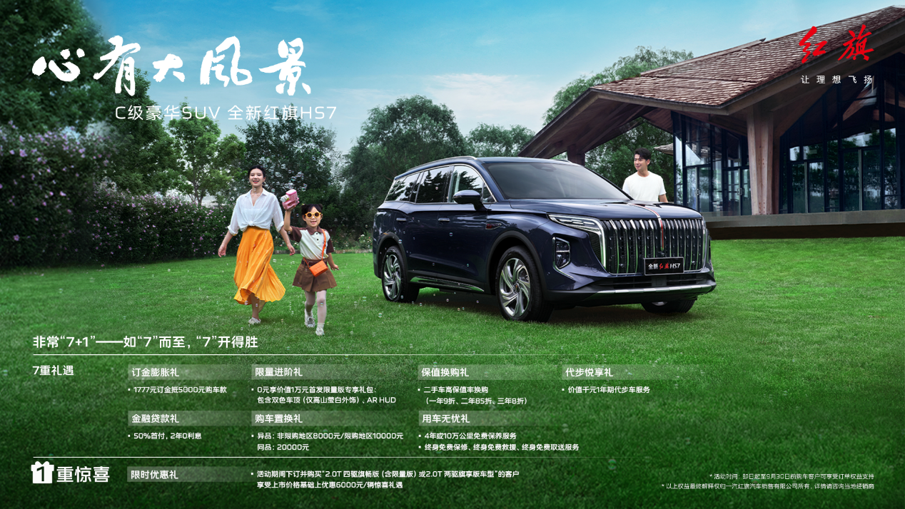 心有大風(fēng)景,胸懷大夢想,奔向新未來。“紅旗”攜手中國航天保障共擎“中國夢”的同時,將以全新紅旗HS7為代表的SUV產(chǎn)品,讓新時代有為人士與萬千和美家庭,一起得遇更大的風(fēng)景,成就祥和美滿的幸福夢。