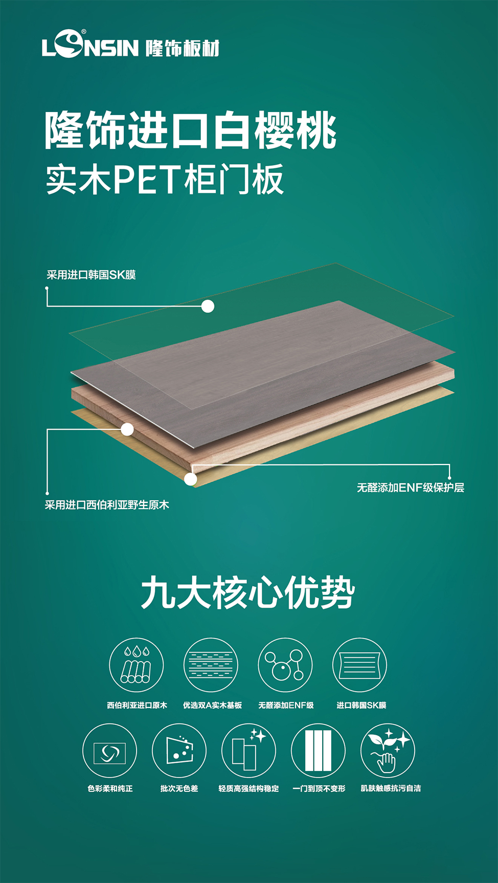 “提升高品質(zhì)服務(wù)、推動綠色家居產(chǎn)業(yè)發(fā)展”是隆飾板材一直以來的發(fā)展使命,多年來,隆飾從未停止研發(fā)創(chuàng)新的步伐,不斷與時俱進,將“工匠精神”融入每一個環(huán)節(jié)中,打造更具競爭力的優(yōu)勢產(chǎn)品和服務(wù)。不僅有一直引以為傲的ENF級生態(tài)板和市場大熱的家具板,隆飾還將重磅推出全新高端產(chǎn)品——“ENF級進口白櫻桃高端實木精板”,滿足了消費者對環(huán)保和品質(zhì)愈發(fā)強烈的追求。