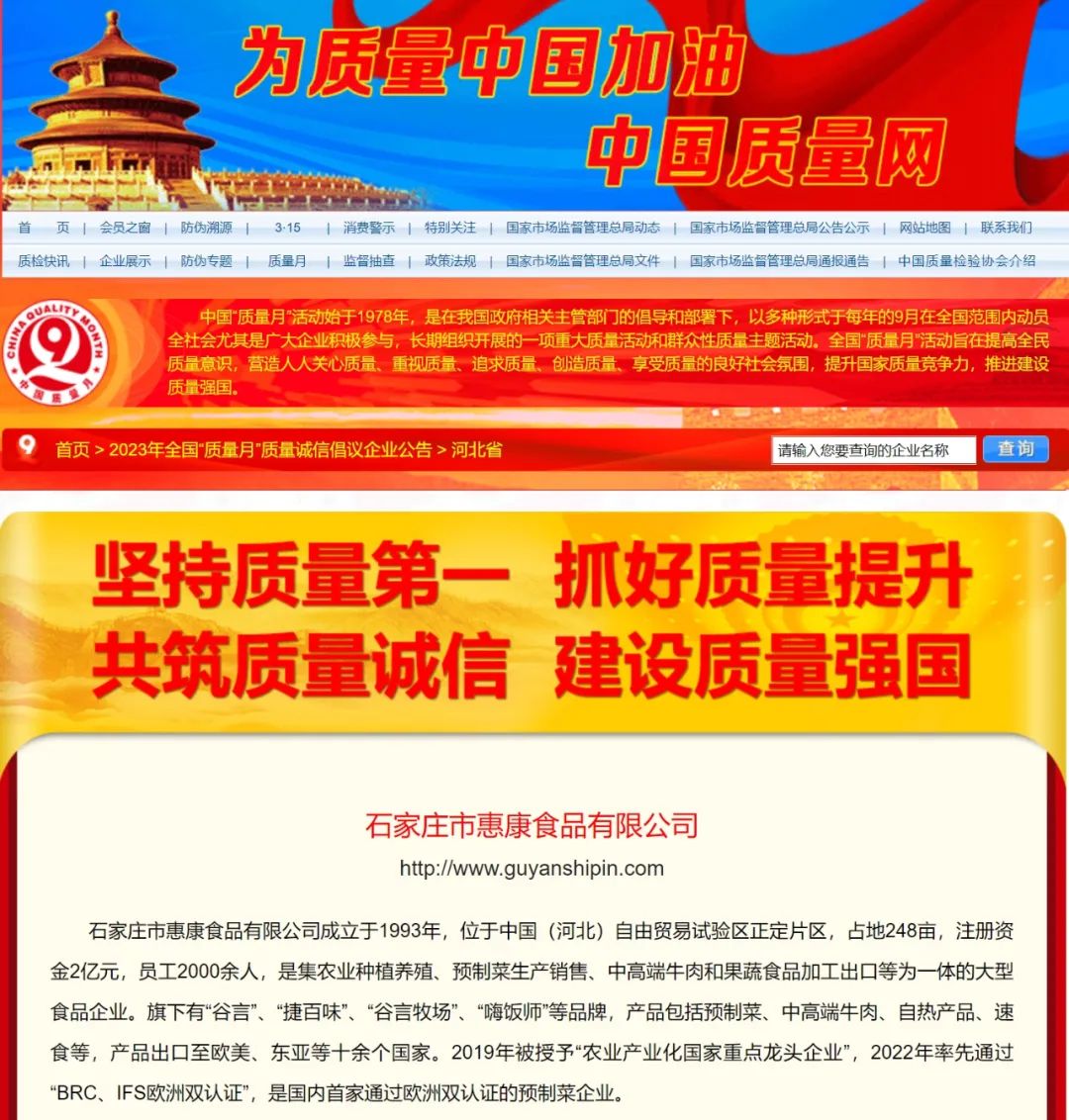 近日,石家莊市惠康食品有限公司再傳捷報,在中國質(zhì)量檢驗協(xié)會組織開展的2023年全國“質(zhì)量月”專題活動中,深耕食品制造行業(yè)30年的惠康食品,憑借過硬的產(chǎn)品質(zhì)量再次被授予“全國質(zhì)量誠信標(biāo)桿企業(yè)”?!吨袊|(zhì)量網(wǎng)》、《中國經(jīng)濟網(wǎng)》、《中國產(chǎn)品質(zhì)量信譽網(wǎng)》等媒體予以集中展示宣傳。這是中國質(zhì)量檢驗協(xié)會、社會各界及消費者對惠康食品產(chǎn)品與服務(wù)質(zhì)量的高度認可。